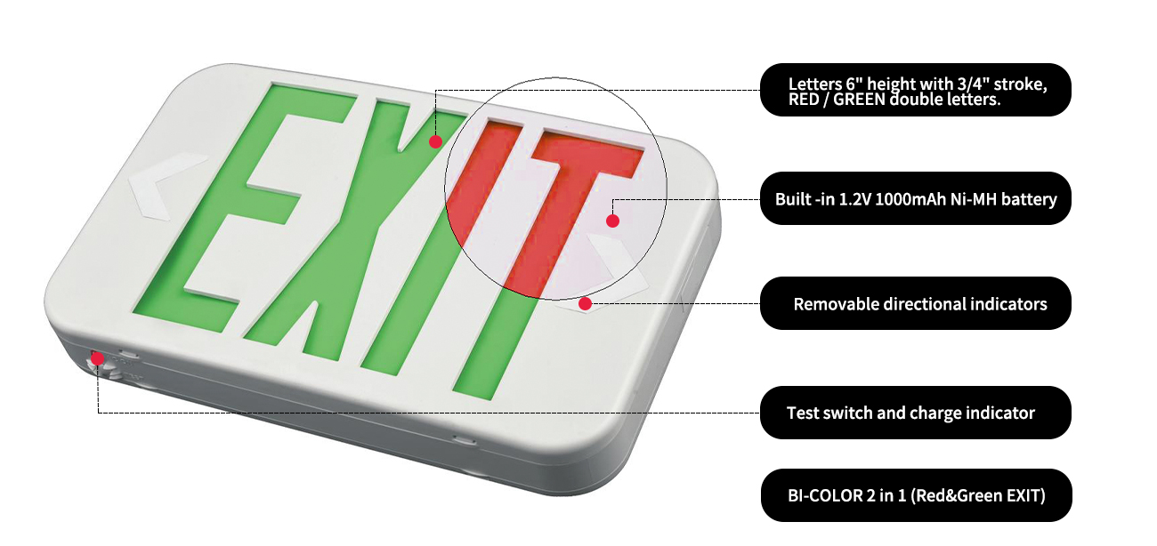 *Aydınlatma - LED çıkış işareti serisi aydınlatma, uzun ömürlü, verimli ultra parlak kırmızı veya yeşil LED'ler kullanılarak elde edilir. Renk eşleştirilmiş difüzör, optimum ışık çıkışı sağlayarak hots noktalarını ve çizgileri ortadan kaldırır.