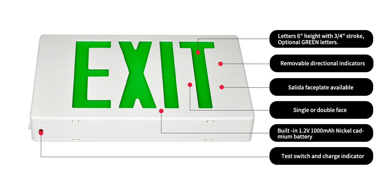 *Aydınlatma - LED çıkış işareti serisi aydınlatma, uzun ömürlü, verimli ultra parlak yeşil LED'ler kullanılarak elde edilir. Renk eşleştirilmiş difüzör, optimum ışık çıkışı sağlayarak hots noktalarını ve çizgileri ortadan kaldırır.