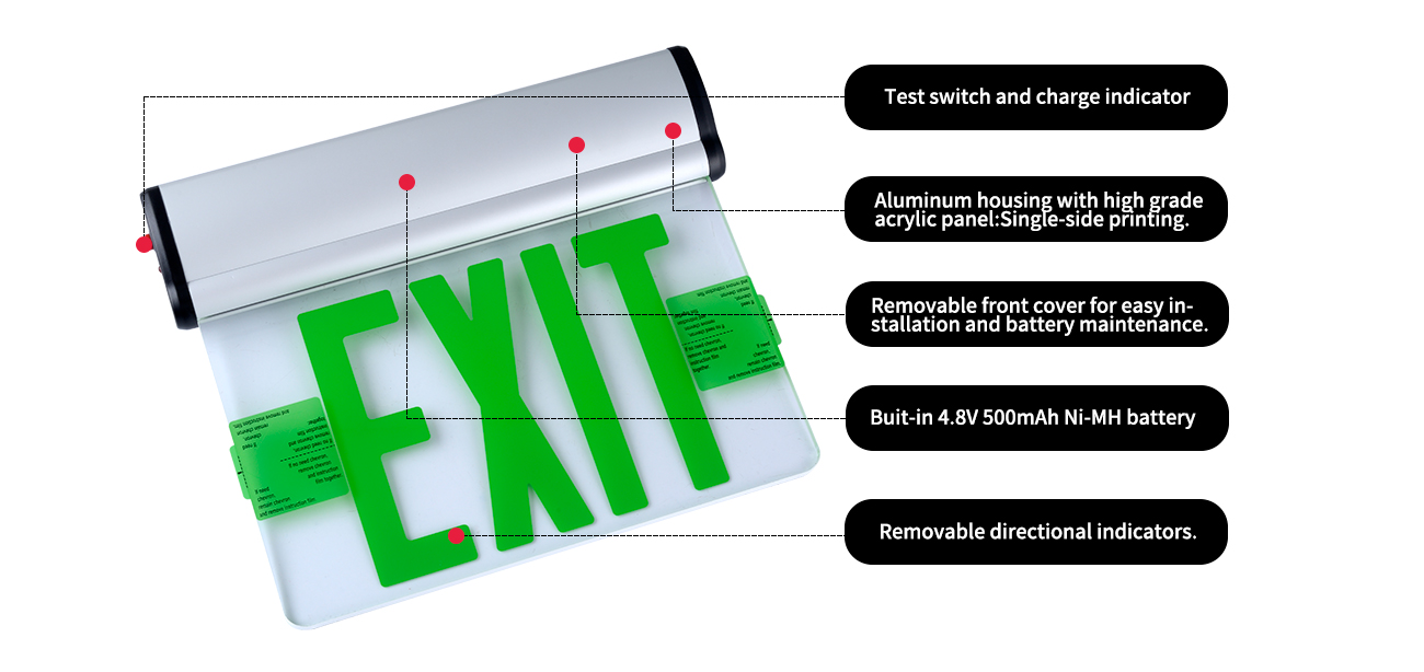*Acil Durum Gücü Pil Yedekleme-Bu kenar aydınlatılmış çıkış işareti serisi 4.8 volt 400mAh bakım gerektirmeyen NI-MH pil ile tasarlanmıştır. Pil, düşük voltajlı bir kesme devresi ile korunur. Pil için çalışma sıcaklığı aralığı 0 ° C (0 ° C) ila 104 ° F (40 ° C).