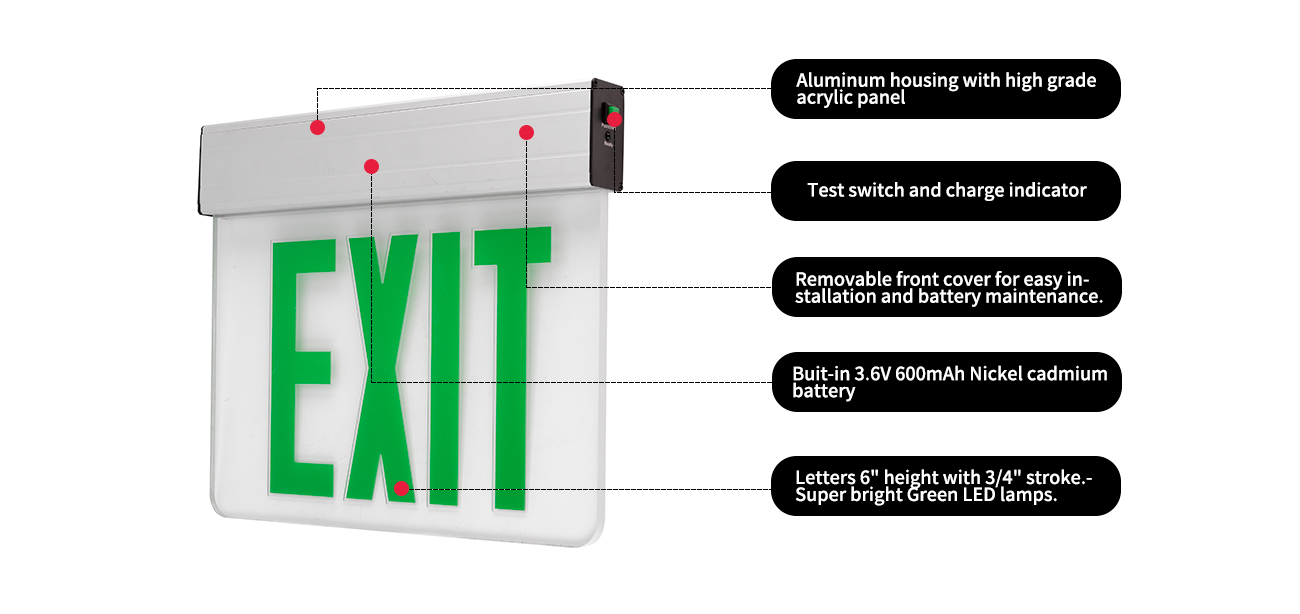 *Acil Durum Gücü Pil Yedekleme-Bu kenar aydınlatılmış çıkış işareti serisi 3.6 volt 600mAh bakım gerektirmeyen NI-CAD pil ile tasarlanmıştır. Pil, düşük voltajlı bir kesme devresi ile korunur. Pil için çalışma sıcaklığı aralığı 0 ° C (0 ° C) ila 104 ° F (40 ° C).